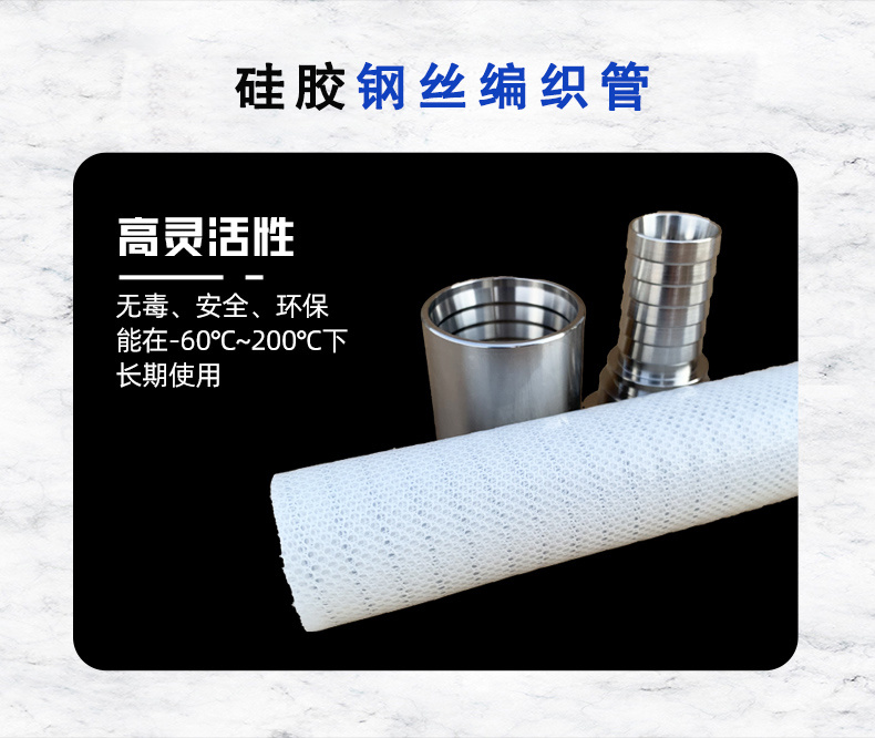 高强度与耐用性:钢丝增强层赋予硅胶钢丝管较高的耐压能力和抗拉强度,使其能够承受较大的压力和负载。同时,硅胶材料的耐老化性能也保证了管道的长久使用寿命
